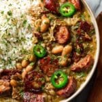 This Authentic Cajun Red Beans and Rice recipe is a hearty and flavorful classic from Louisiana, featuring tender red kidney beans slow-simmered with smoky andouille sausage, crispy bacon, and aromatic vegetables. This comforting dish is perfectly seasoned with Cajun spices, herbs, and served over fluffy long grain white rice, ideal for a satisfying family meal.