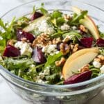 - Assemble the salad: In a medium to large bowl, place the arugula as the base. Add the roasted beet slices, apple slices, shallot, walnuts, and crumbled goat cheese on top.