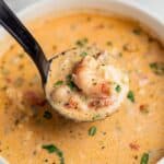 The image shows a close-up of a creamy soup served in a white bowl resting on a white marbled surface. The soup has a thick texture and a light orange color with visible small chunks of white beans, pink shrimp pieces, and green chopped herbs scattered on top. A black ladle is dipped into the soup, lifting a portion that shows the creamy orange broth mixed with shrimp, beans, and green herb pieces in detail. The smoothness of the broth contrasts with the textures of the ingredients inside it. Photo taken with an iphone --ar 4:5 --v 7
