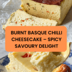 This Burnt Basque Chilli Cheesecake is a bold and creamy twist on the classic cheesecake, packed with a variety of cheeses and a spicy kick from fresh chillies. Perfect as a savory appetizer, it pairs wonderfully with crunchy baguette slices for a delightful snack or party dish.