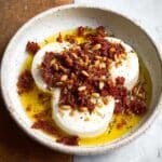 Store any leftover dip in an airtight container in the refrigerator for up to 2 days. Because burrata is best fresh, the texture may change upon storing. Reheat gently to room temperature before serving, but it’s best enjoyed fresh.