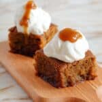 Two square pieces of soft, brown cake with a slightly rough texture are placed on a light wooden cutting board with a handle. Each cake piece is topped with a dollop of white whipped cream, which looks light and fluffy, and a small spoonful of shiny, amber caramel sauce sitting on top of the whipped cream. The wooden board rests on a surface with a white marbled texture. photo taken with an iphone --ar 4:5 --v 7