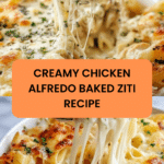 Chicken Alfredo Baked Ziti is a comforting and creamy pasta dish combining tender chicken, al dente ziti pasta, and a rich homemade Alfredo sauce made with butter, garlic, cream, and Parmesan cheese. Topped with melted mozzarella and Parmesan cheese and baked to golden perfection, this hearty casserole is perfect for family dinners or special occasions.