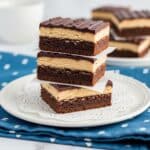 The image shows a stack of three layered dessert bars on a white plate with a delicate white doily and parchment paper beneath them, placed on a blue cloth with white patterns over a white marbled surface. Each bar has three layers: the bottom and middle layers are thick, dark brown, moist brownie cake; the middle and top layers are creamy, light tan peanut butter frosting; and the top layer is a smooth, shiny dark chocolate ganache with slight ridges. The stack is slightly uneven, with crisp edges and a dense texture. In the blurred background, a white cup and additional bars are visible. Photo taken with an iphone --ar 4:5 --v 7