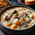 Keywords: Philly Cheese Steak Soup, creamy beef soup, comfort food soup, provolone cheese soup, easy stovetop soup
