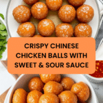 Crispy Chinese Chicken Balls served with a tangy and sweet homemade sweet and sour sauce. This recipe features tender chicken chunks battered and fried to golden perfection, paired with a smooth and flavorful sauce made from ketchup, brown sugar, vinegar, and lemon juice. Perfect as an appetizer or a main dish, these chicken balls offer a delightful combination of crispy texture and vibrant taste.