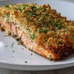 Store leftover salmon in an airtight container in the refrigerator for up to 2 days. To reheat, warm gently in a low oven (around 275°F/135°C) to help preserve the crispy topping, or use a microwave but expect the crust to soften.