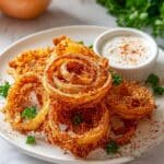 Keywords: Onion rings, crispy onion chips, air fryer onion rings, baked onion rings, crunchy snack, Parmesan onion chips