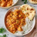 - Serve and Garnish: Serve the butter chicken hot over white rice or with warm naan bread. Garnish with fresh cilantro if desired for added freshness and color.