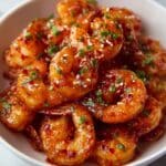 Firecracker Shrimp is a flavorful and crispy dish featuring large shrimp marinated in a spicy-sweet sauce, dredged in a light flour and cornstarch coating, then pan-fried to golden perfection. Garnished with green onions and sesame seeds, it’s a perfect appetizer or main served hot with dipping sauces or rice.