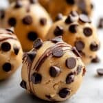 Close-up of several round cookie dough balls covered in light brown dough, each decorated with many dark brown smooth chocolate chips embedded and scattered on the surface. A few thin lines of the same light brown dough are drizzled on top, creating a textured look. The cookie dough balls are placed closely together on a white marbled surface, giving a soft but slightly shiny appearance. The focus is on the front cookie dough ball with the others blurred slightly in the background. photo taken with an iphone --ar 4:5 --v 7