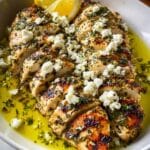 - Assemble and Serve: Transfer the cooked chicken onto a serving plate. Drizzle the reserved marinade over the top, then sprinkle with crumbled feta cheese and freshly chopped parsley. Garnish with additional lemon wedges and serve immediately.