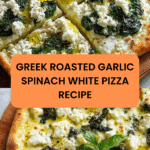 This Greek Roasted Garlic Spinach White Pizza is a delightful twist on traditional pizza, featuring a flavorful roasted garlic ricotta base topped with sautéed spinach, mozzarella, feta, and Parmesan cheeses. The pizza is baked to golden perfection and garnished with fresh basil, creating a rich and creamy vegetarian-friendly meal that’s perfect for any occasion.