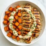 This Healthy Chicken & Sweet Potato Rice Bowl is a balanced and delicious meal featuring tender, seasoned chicken breast, roasted sweet potatoes, and wholesome brown rice, all brought together with a creamy tahini-lemon drizzle. Perfect for a nutritious lunch or dinner, this bowl combines complex carbohydrates, lean protein, and healthy fats for a satisfying and flavorful dish.