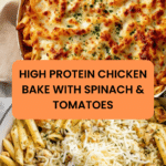 This High Protein Chicken Bake is a delicious and nutritious meal featuring tender chicken breasts topped with a creamy Greek yogurt and spinach mixture, mozzarella cheese, and fresh cherry tomatoes. Baked to perfection, it offers a flavorful and healthy option for a wholesome dinner that’s packed with protein and vibrant ingredients.