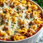 Keywords: beef tortellini bake, cheesy tortellini casserole, easy comfort food, ground beef pasta bake, baked tortellini recipe