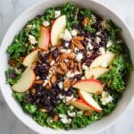 A vibrant and healthy kale salad featuring crisp apples, chewy dried cherries, toasted almonds, and tangy feta cheese, all brought together with a zesty dressing made from olive oil, red wine vinegar, and fresh orange juice. This refreshing salad is perfect as a light lunch or a flavorful side dish.