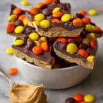 Keywords: peanut butter cup bark, Reese’s Pieces dessert, chocolate peanut butter bark, easy no-bake dessert, holiday treat, peanut butter candy bark