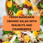A fresh and vibrant Mandarin Orange Salad featuring a mix of baby spinach and arugula, complemented by sweet mandarin oranges, crunchy toasted walnuts, and dried cranberries. Tossed in a zesty homemade poppy seed vinaigrette and topped with shaved Parmesan, this salad is perfect for a light lunch or a flavorful side dish.