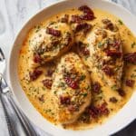 Marry Me Chicken is a luscious, creamy skillet chicken dish featuring tender chicken cutlets cooked to golden perfection in a rich sauce made with garlic, sun-dried tomatoes, Parmesan, and fresh herbs. This comforting recipe combines a flavorful blend of spices and herbs with a velvety cream sauce that’s perfect served over pasta, rice, or your favorite side.