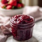 A small glass jar filled with chunky, deep red berry jam, slightly overflowing at the top with a thick, textured surface showing visible seeds and pieces of fruit. The jar sits on a white marbled surface next to a soft pinkish cloth, and in the blurred background, there is a white bowl filled with fresh red strawberries with green leaves. The overall setting has bright natural light highlighting the rich color and texture of the jam. Photo taken with an iphone --ar 4:5 --v 7