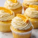 The image shows four cupcakes on a white marbled surface, each with two layers visible: a golden-yellow cake base and a thick swirl of creamy white frosting on top. The frosting has a smooth, slightly ridged texture from the piped swirl, with a small slice of orange placed gently against the side of the frosting on each cupcake. The cupcakes are in white paper liners, and the lighting highlights their soft, moist texture and the bright orange color of the fruit slices. Photo taken with an iphone --ar 4:5 --v 7