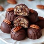 Pecan Pie Balls are a delightful no-bake treat that combines the rich flavors of pecans, chocolate, and maple syrup into bite-sized balls. Coated in melted semi-sweet chocolate and garnished with extra chopped pecans, these sweet snacks are perfect for an easy dessert or festive snack that requires no oven time.