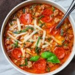 Keywords: Pizza Soup, Italian Soup, Sausage Soup, Tomato Soup, Comfort Food, Easy Soup Recipe