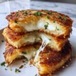 A stack of three thick, golden-brown grilled cheese sandwiches with crispy, slightly charred edges sits on a white marbled surface. Each sandwich shows a thick outer toasted layer with a bubbly, creamy melted cheese center that stretches between layers. The top sandwich is cut in half revealing gooey, white cheese oozing out and small green herb bits scattered inside and on top. The texture of the toasted bread is crunchy with a warm, inviting glow from the melted cheese inside. Fresh green herbs add a touch of color on and around the stack. Photo taken with an iphone --ar 4:5 --v 7