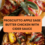 This Prosciutto Apple and Sage Butter Chicken with Cider Pan Sauce is a delightful blend of savory and sweet flavors. Juicy boneless chicken breasts are stuffed with prosciutto, thinly sliced apples, and fresh sage, then seared to a golden brown before roasting in the oven. The dish is complemented by a silky apple cider pan sauce that adds a tangy richness, making it perfect for an elegant yet easy weeknight dinner.