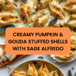 These Pumpkin & Gouda Stuffed Shells are a cozy, flavorful fall-inspired pasta dish featuring jumbo shells filled with a creamy pumpkin, ricotta, and smoked Gouda mixture. Topped with a luscious brown butter and sage Alfredo sauce, this baked casserole combines rich, nutty flavors and a smooth, velvety texture perfect for a comforting meal.