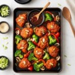 This Sheet Pan General Tso’s Chicken recipe is a quick and easy one-pan meal featuring crispy breaded popcorn chicken and vibrant vegetables all baked together and tossed in a flavorful General Tso’s sauce. Perfect for a hassle-free weeknight dinner served with steamed white rice.