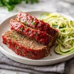 Two thick slices of meatloaf with a coarse, browned texture and a rich red tomato sauce spread on top, sprinkled lightly with small green parsley pieces. The meatloaf layers have a moist, crumbly look with some herbs inside. Next to the meatloaf, there is a serving of pale green and white spiralized zucchini noodles arranged loosely. All this is on a white plate, set on a gray cloth over a white marbled surface with some green parsley leaves blurred in the background. photo taken with an iphone --ar 4:5 --v 7