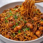 This Sticky Garlic Chicken Noodles recipe is a flavorful and easy-to-make dish featuring tender chicken coated in a sweet and savory garlic soy sauce. Perfectly cooked noodles are tossed with the sticky chicken mixture and garnished with fresh green onions and sesame seeds for a delicious, satisfying meal that comes together quickly on the stovetop.