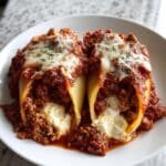 Keywords: Stuffed manicotti, meat sauce, baked pasta, Italian comfort food, ricotta filling, mozzarella, Italian sausage, ground beef