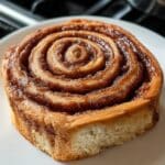 A thick cinnamon roll sits on a white plate, showing a tight spiral pattern from the center to the edge. The outer layer is a golden-brown baked dough with a soft texture, while the inner spiral layers alternate between light tan dough and rich, glossy dark brown cinnamon sugar swirls that look sticky and shiny. The cinnamon sugar layers are evenly spread, giving the roll a textured look that appears moist and sweet. The roll has slightly raised edges that give it a defined shape. The background is a white marbled surface with parts of a dark stove blurred in the distance. Photo taken with an iphone --ar 4:5 --v 7