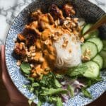 Keywords: Thai peanut chicken, peanut satay sauce, vermicelli noodles, cucumber salad, Asian chicken bowl, easy Thai recipe, quick weeknight dinner