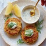 - Serve: Serve the vegan crab cakes hot with vegan tartar sauce, lemon wedges, and a garnish of chopped green onions. Enjoy!