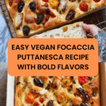 This Vegan Focaccia Puttanesca is a flavorful twist on a classic Italian bread, loaded with sun-dried tomatoes, olives, garlic, and capers. Crispy on the outside and soft inside, it’s perfect as a snack or alongside your favorite meal.